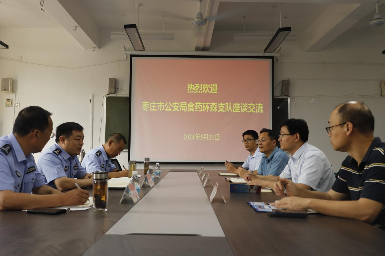 5月21日上午,枣庄市公安局食药环森支队支队长刘成彬,一大队大队长周海生,三大队队长袁汝洋一行3人来买球官方网站座谈交流。学院党委书记滕聿峰、院长王京龙、副院长孙中贯、杜健陪同座谈。