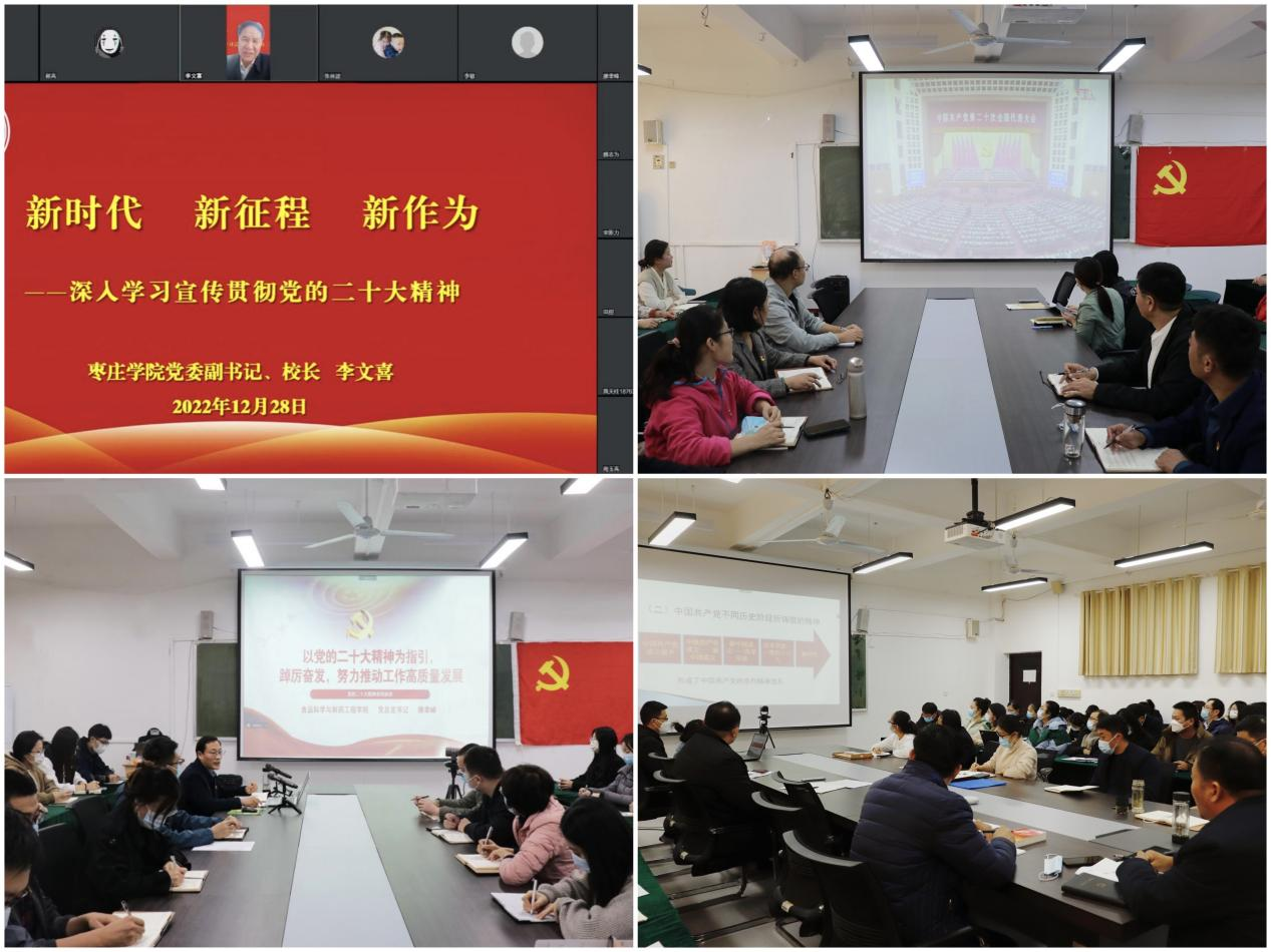 10月16日至22日,学院积极组织广大师生通过多种方式收听收看开幕会、闭幕会直播,学习热议党的二十大精神。随后,根据学校党委统一部署,结合学院工作实际,出台《买球官方网站学习宣传贯彻党的二十大精神工作实施方案》,制定宣讲计划,开展学习培训,分层分类,有效推动党的二十大精神入脑入心。12月28日,校党委副书记、校长李文喜为学院全体教师党员作了题为《新时代 新征程 新作为——深入学习宣传贯彻党的二十大精神》的宣讲报告,学院领导班子开展系列宣讲活动4次,受众师生1000余人次,着力推进舆论宣传和理论研究阐释,切实把学习成果转化为推动学院各项事业高质量发展的实际成效。