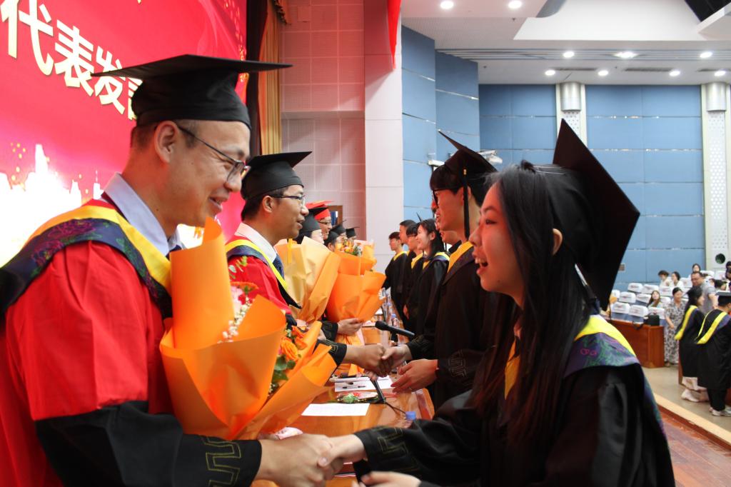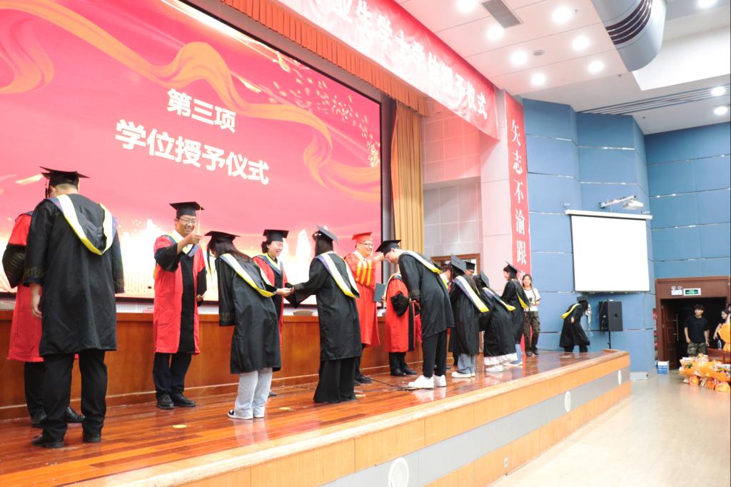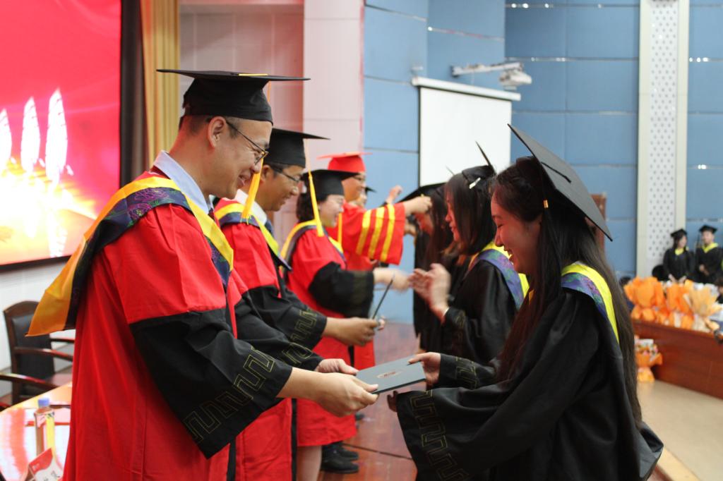 典礼上领导与毕业生亲切握手,为全体优秀毕业生一一拨穗正冠,颁发学士学位证书,并为毕业生们送出殷切期望和祝福。