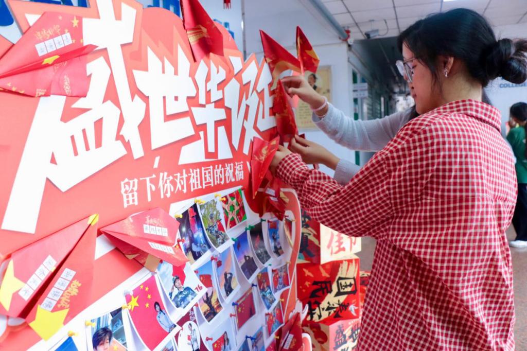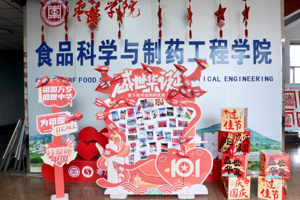 活动现场,学院精心布置了多重互动区域,其中主题打卡区以国旗、华表等元素营造出浓厚节日氛围,学生们在此驻足拍照,沉浸式感受国庆的庄严与喜悦;“欢度国庆”专属展板前人头攒动,不仅张贴着数十张“我和国旗合个影”的鲜活照片,更设置了“手写祝福墙”,同学们将“祝祖国繁荣昌盛”“以青春护华夏”等真挚寄语写在红色信笺上,折成纸飞机轻轻投掷,满载着青年学子炽热的家国情怀,成为现场最动人的风景线。