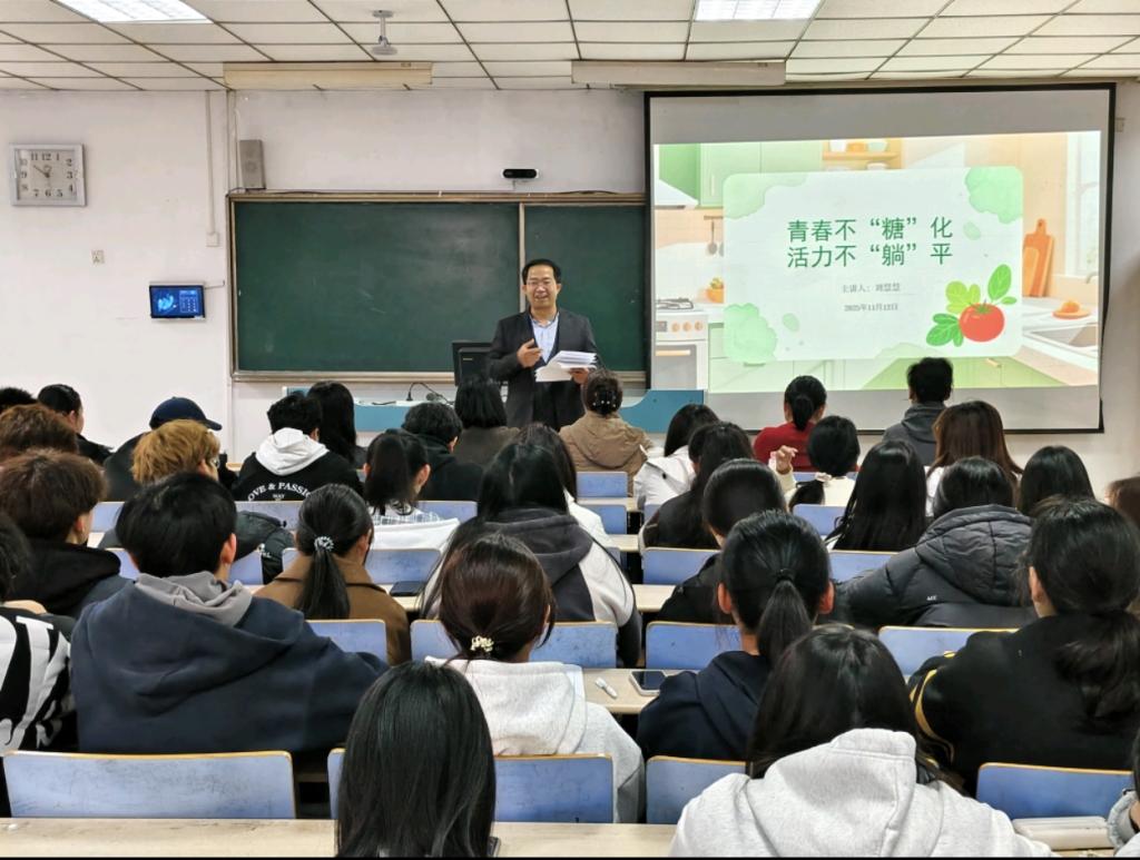 随后,刘慧慧主任以《青春不“糖”化,活力不“躺”平——健康生活方式,是你最值得的“投资”》为题开展专题讲座。作为内分泌专业硕士、副主任医师,刘主任结合临床案例与权威数据,深入浅出地剖析了高糖饮食、久坐不动、熬夜等不良习惯的健康危害,解读了肥胖与糖尿病的密切关联,重点阐述了“会吃、爱动、睡好、心安”四大健康支柱的实操方法。从如何识别“隐形糖”、久坐后快速拉伸技巧,到规律作息的养成方案,内容紧贴校园生活,干货满满,让在场师生深受启发。