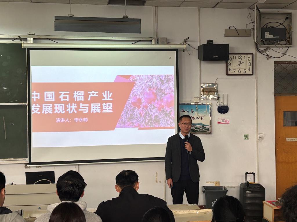 授课中,李永帅教授以“产业现状—发展挑战—未来方向”为脉络,结合自身实践经验展开讲解。在产业现状部分,他通过数据梳理我国石榴主产区分布、种植规模及品种改良成果,同时介绍了从鲜果销售到精深加工的产业链延伸情况。他介绍当前石榴产业存在品种结构不合理、高值高效栽培技术缺乏、精深加工和产品创新滞后等问题,并结合枣庄本地石榴产业案例分析原因;在未来展望环节,他提出应从品种创新与结构优化、全产业链深度融合与高值化利用、品牌化与营销数字化四个维度突破石榴产业发展瓶颈。