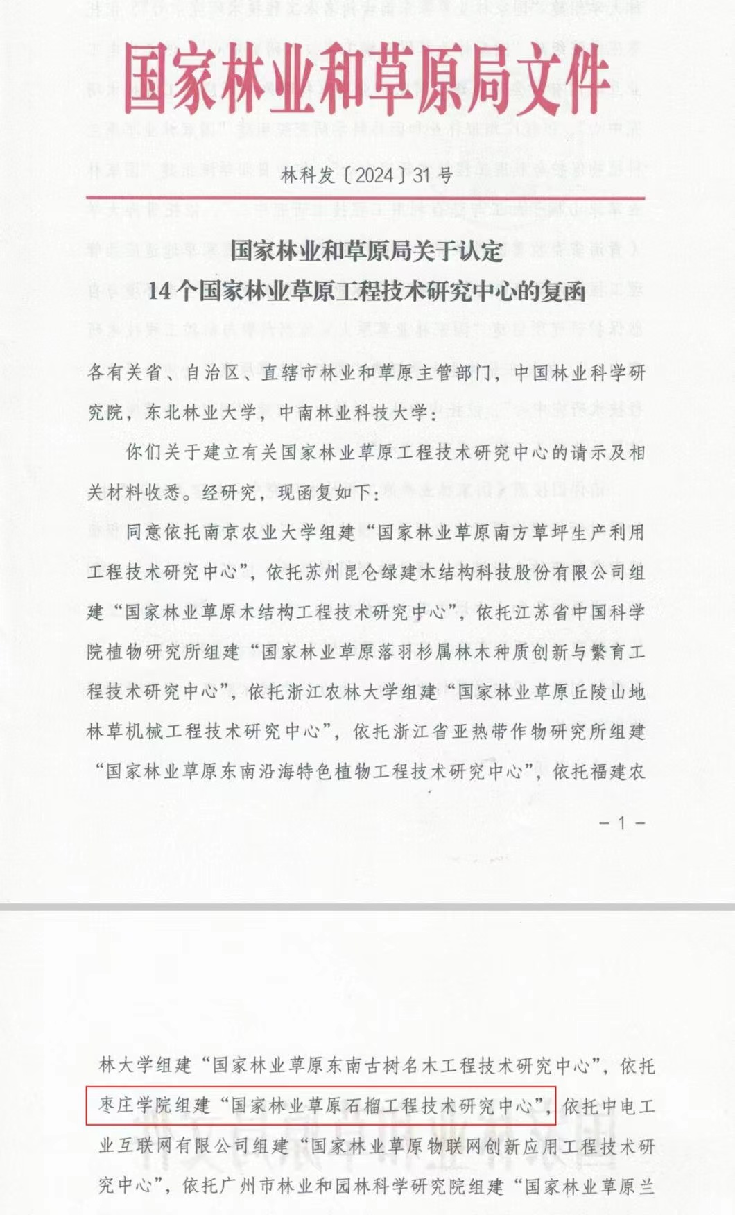 近日,国家林业和草原局发布《关于认定14个国家林业草原工程技术研究中心的复函》(林科发〔2024〕31号),依托买球官网组建的“国家林业草原石榴工程技术研究中心”获批。