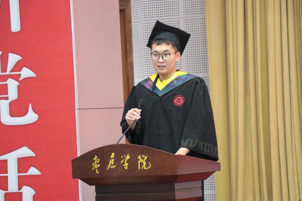 2021级制药工程本科1班学生张道灿代表在校生发言,向圆满完成学业,即将扬帆起航踏上人生新征程的师哥师姐送上最衷心的祝愿,表示将以师哥师姐们为榜样,认真刻苦、积极奋发、坚定初心、一往无前,以自己优异的成绩,用自己的实际行动为母校的发展进步贡献我们的青春和力量。