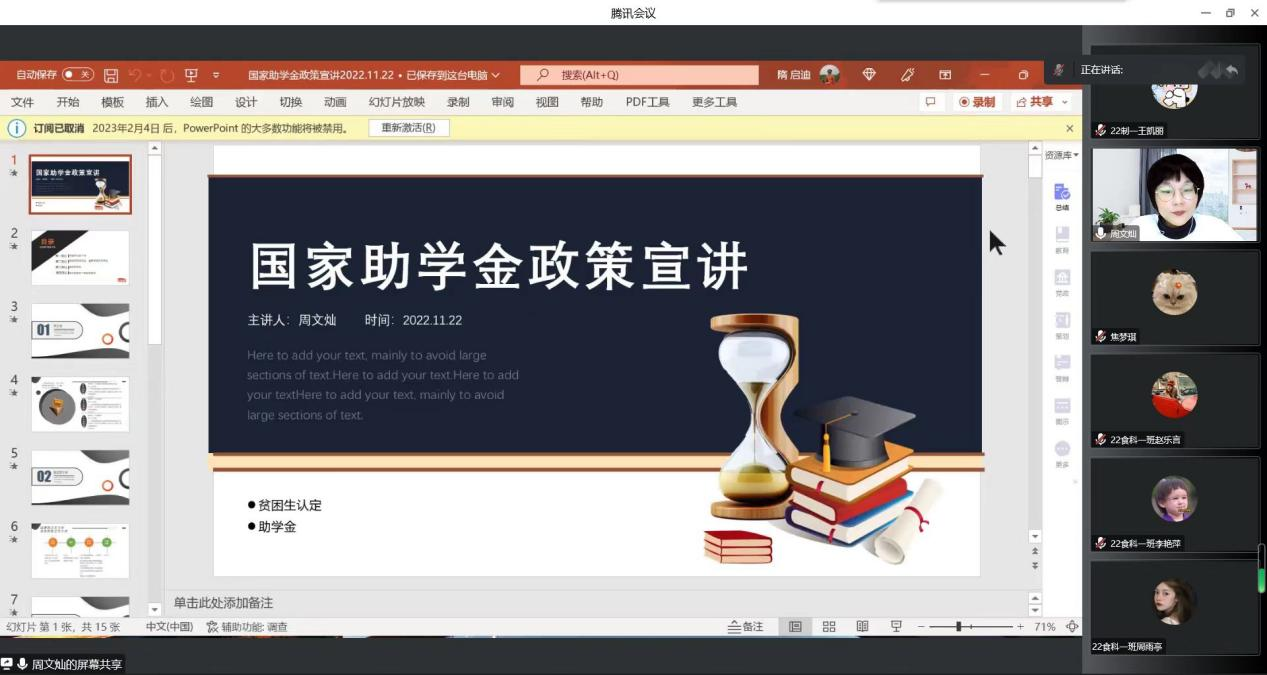 为全面推进资助育人,增强资助政策的宣传力度,增进学生对资助政策的了解和认识,买球官方网站于11月22日在线上举办国家助学金政策宣讲会。本次会议由学院辅导员周文灿老师担任主讲,2022级全体学生参加。