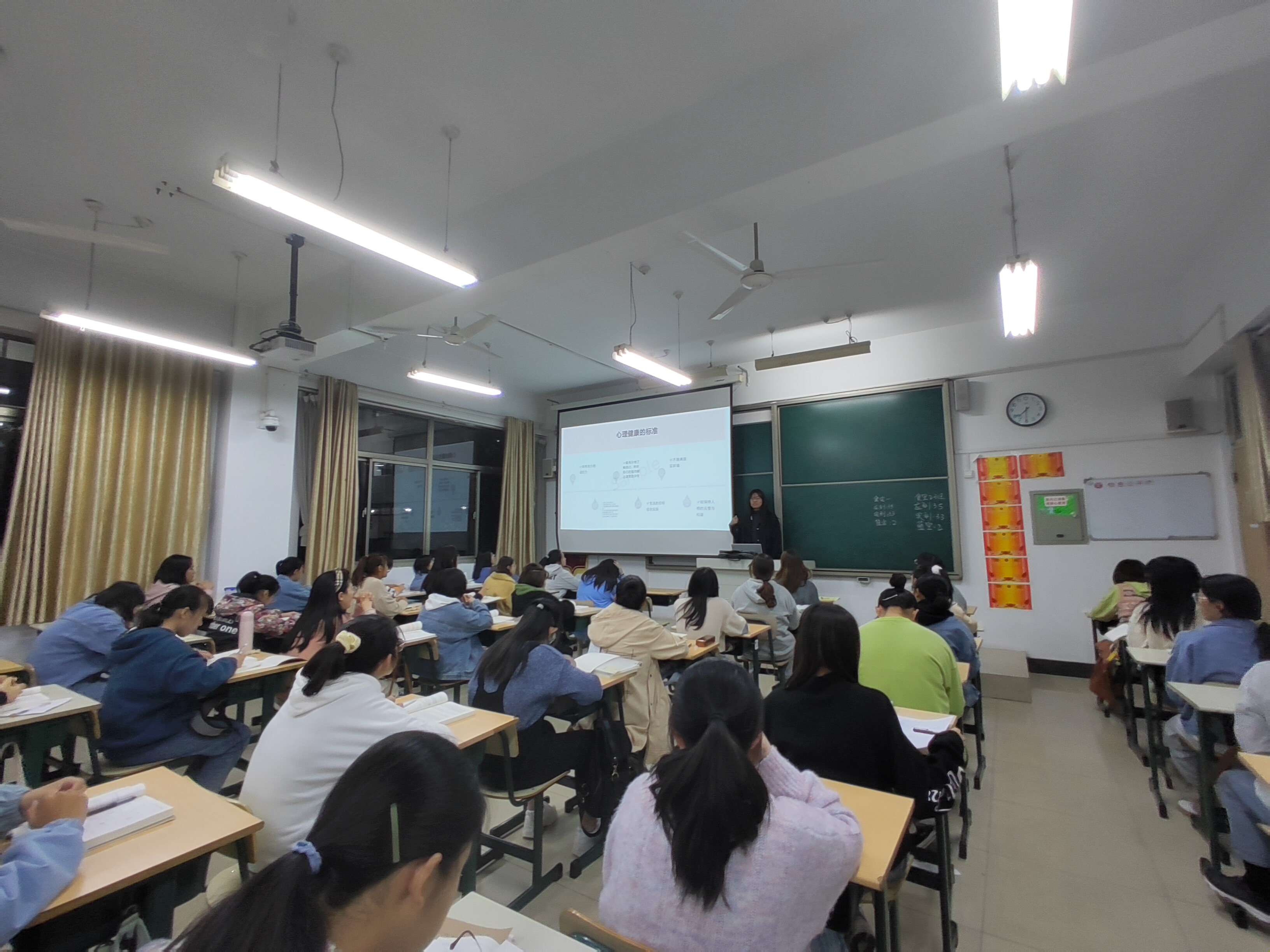 各班心理委员以PPT解说的形式向同学们普及心理健康知识,重点介绍了心理健康在社交、生产、生活上与其他人保持良好沟通的重要性;通过分析同学们存在的心理健康问题,如压力或焦虑,人际冲突等,向同学们介绍了影响心理健康的因素,使同学们更好的认识到外界因素对自己心理健康造成的影响;最后向同学们介绍了多种保持心理健康的方法,如清楚认识自己,接纳自己,提升自己,培养坚强、乐观、开朗的性格等多种方式。