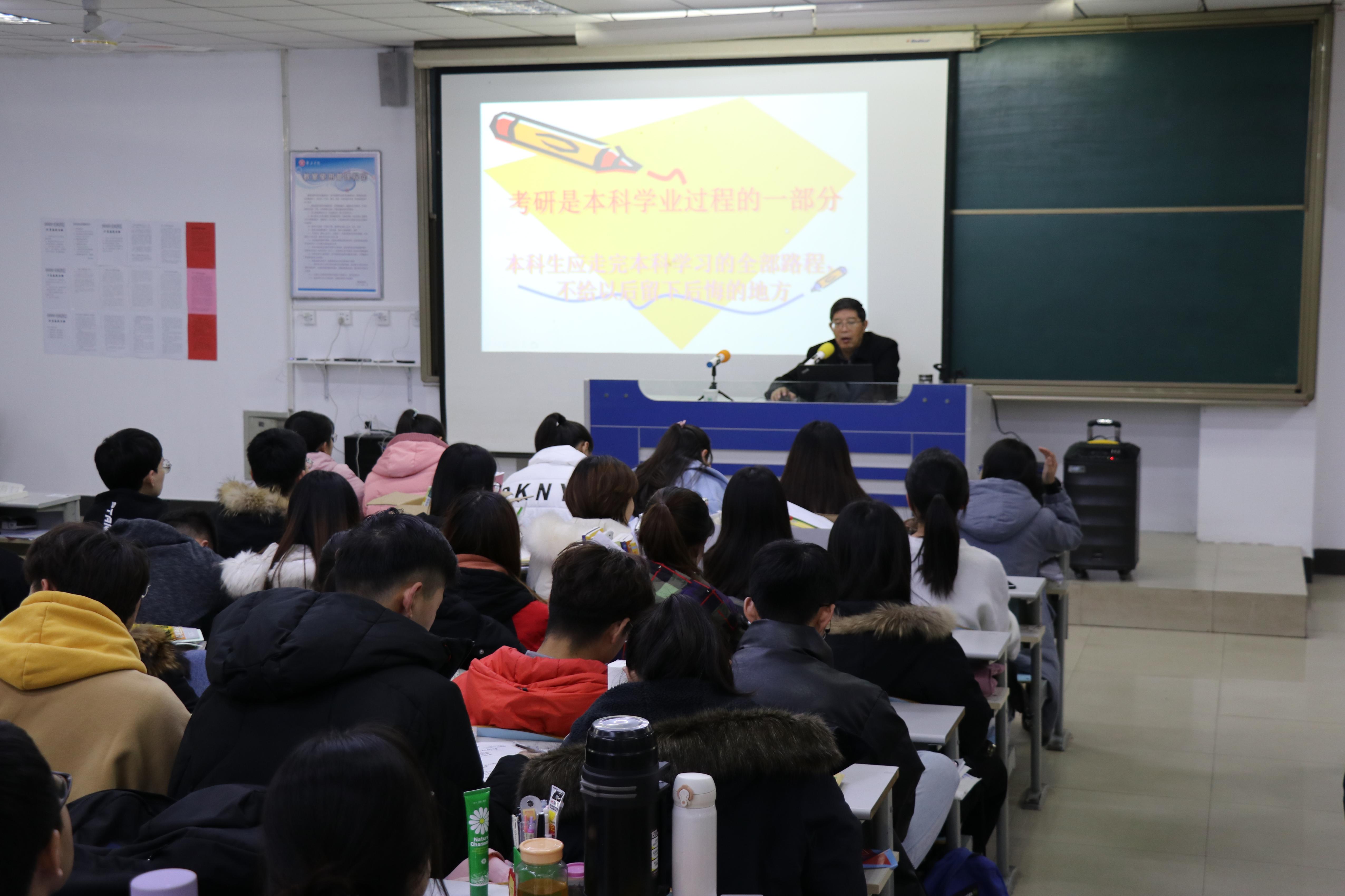 会上,王院长围绕学生最为关注的问题“为什么要考研”,从研究生教育是国际高等教育发展趋势,是我国社会发展现实需要,是同龄人学历台阶跨越的需求等方面进行了讲述。王院长讲,考研是本科学业过程的一部分,是本科阶段必须要经历的一个过程,同学们应走完本科学习的全部路程,不给自己人生留下遗憾。此外,王院长详细地介绍了近三年来中国研究生考试的报考情况、报考形势、报考政策、考研准备策略等问题,号召同学们应在前期选好学校,在中期做好基础性复习,在后期做好系统化学习和应试准备,复试阶段做好学校调剂。最后,王院长号召同学们及早确立奋斗目标,增强考研的信心、考研必胜的决心。