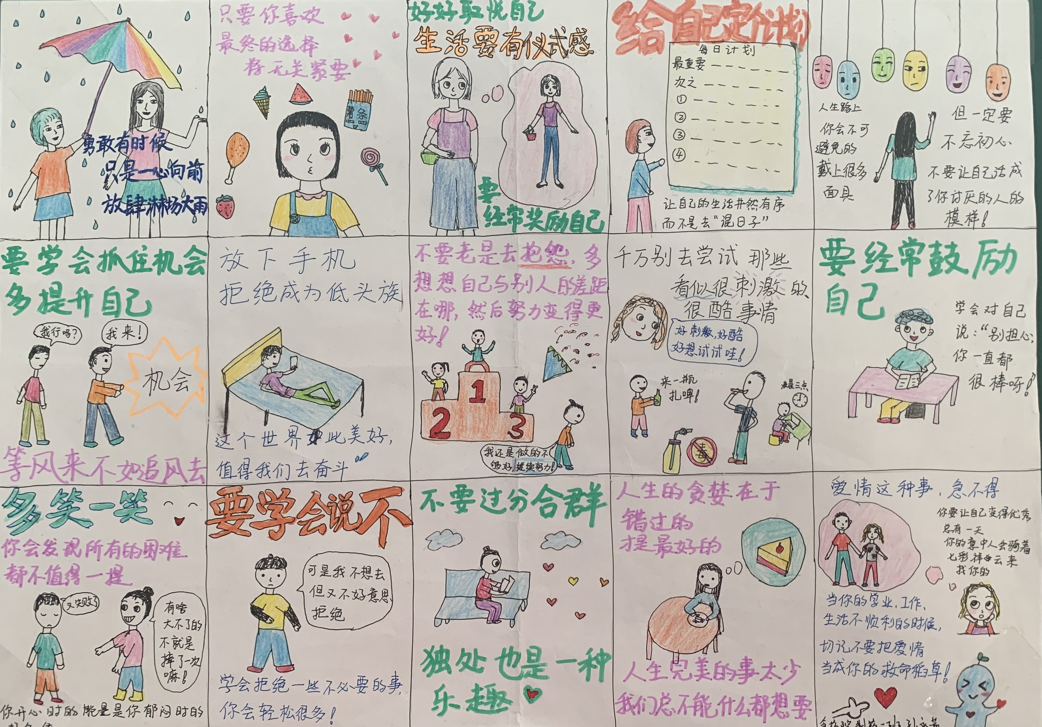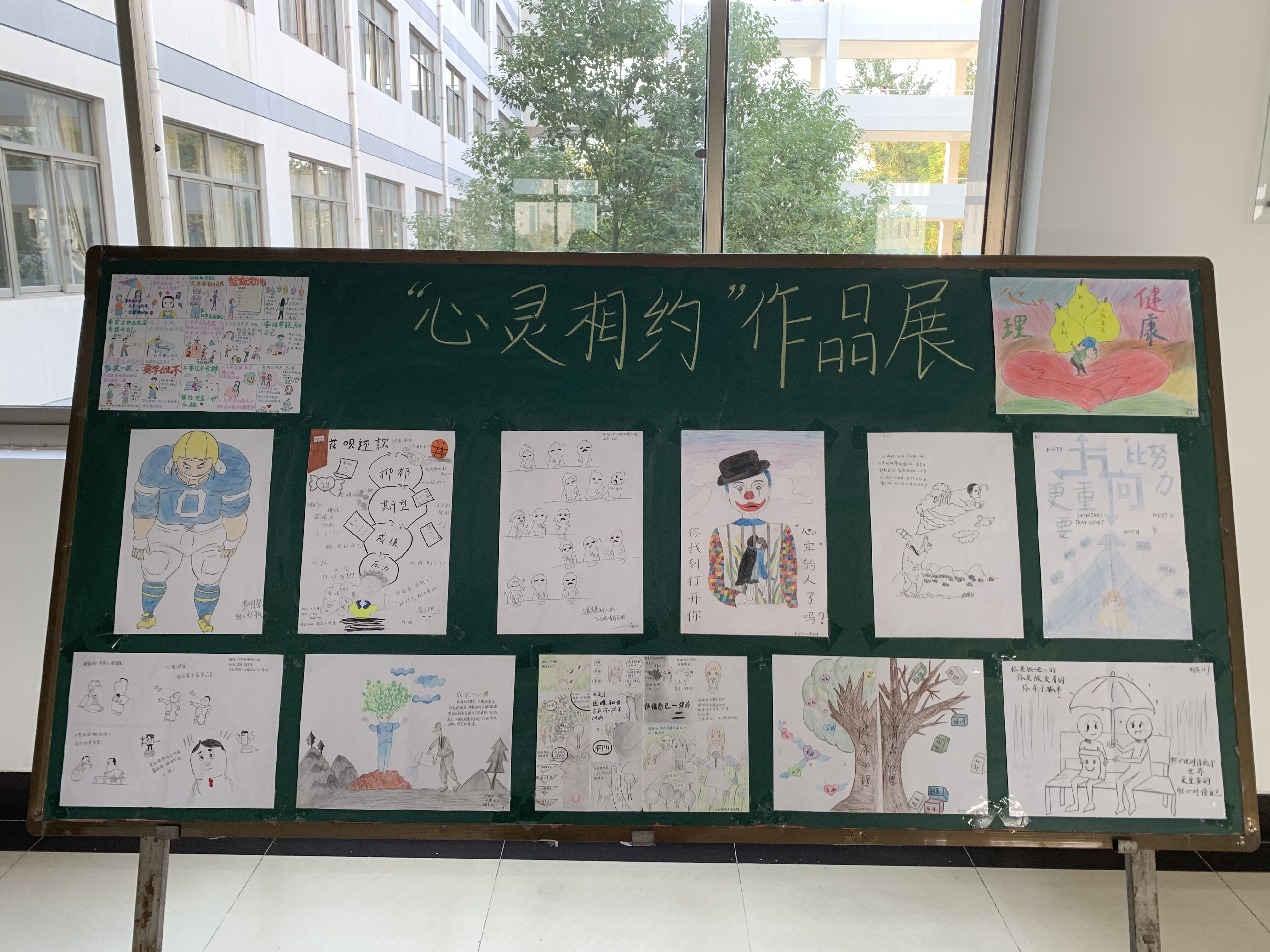 此次活动以心理漫画、趣味心理图片进行展览,学生将日常学习、生活、心理状态以形象、生动的艺术形式展现出来。作品内容健康向上,以学生常见的心理现象为创作基础,有一定思想深度、格调清新、高雅、健康并给人以启迪,让学生真正从作品的含义中体验到心理健康,能充分展示学生良好的精神面貌和朝气蓬勃的青春气息。以此来引导学生注重培养积极向上的心理状态,燃起互助意识,增强校园凝聚力。