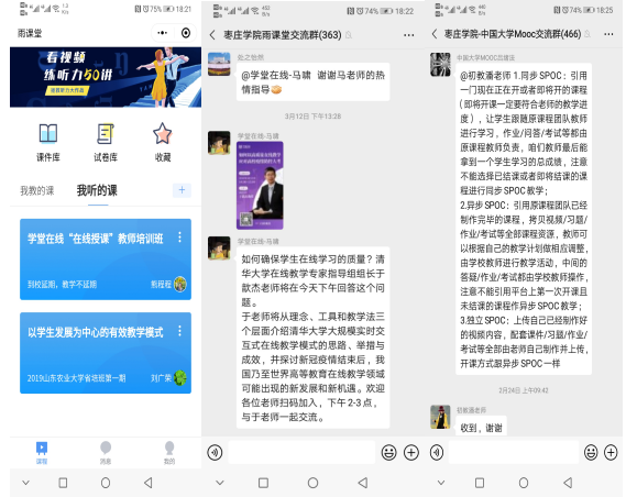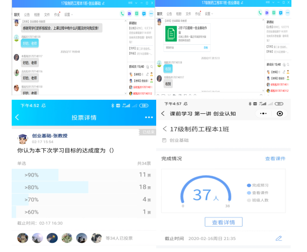 在每一次课程结束时,团队老师们还会进行交流、分享线上教学经验,根据此次课程进度和效果,积极做出相应的调整,教学方式上也在持续改进,如一开始采用雨课堂平台授课,因刚开课时上线人数较多,网络较卡顿;做出了调整改用QQ直播,比较流畅,但存在不能回放的缺点;之后改为钉钉直播平台授课,目前又把钉钉与雨课堂结合起来,收到了良好的效果。通过这几周的线上课堂教学,学生反馈教好,团队老师们也会再接再厉,做传道授业解惑者。