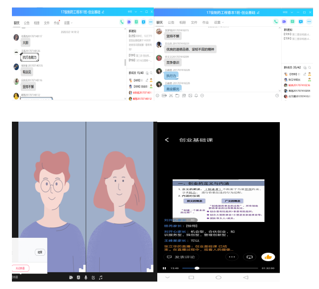 根据《创业基础》课程的性质,任课教师对于知识点的讲述时,会较多的采取案例分析的方式进行,此外每一堂课都会安排3-5个互动环节,让同学们踊跃发表自己的观点,或者通过点名、开麦的方式语音回答问题,同学们的参与度很高,较好地保证了线上教学的效果。