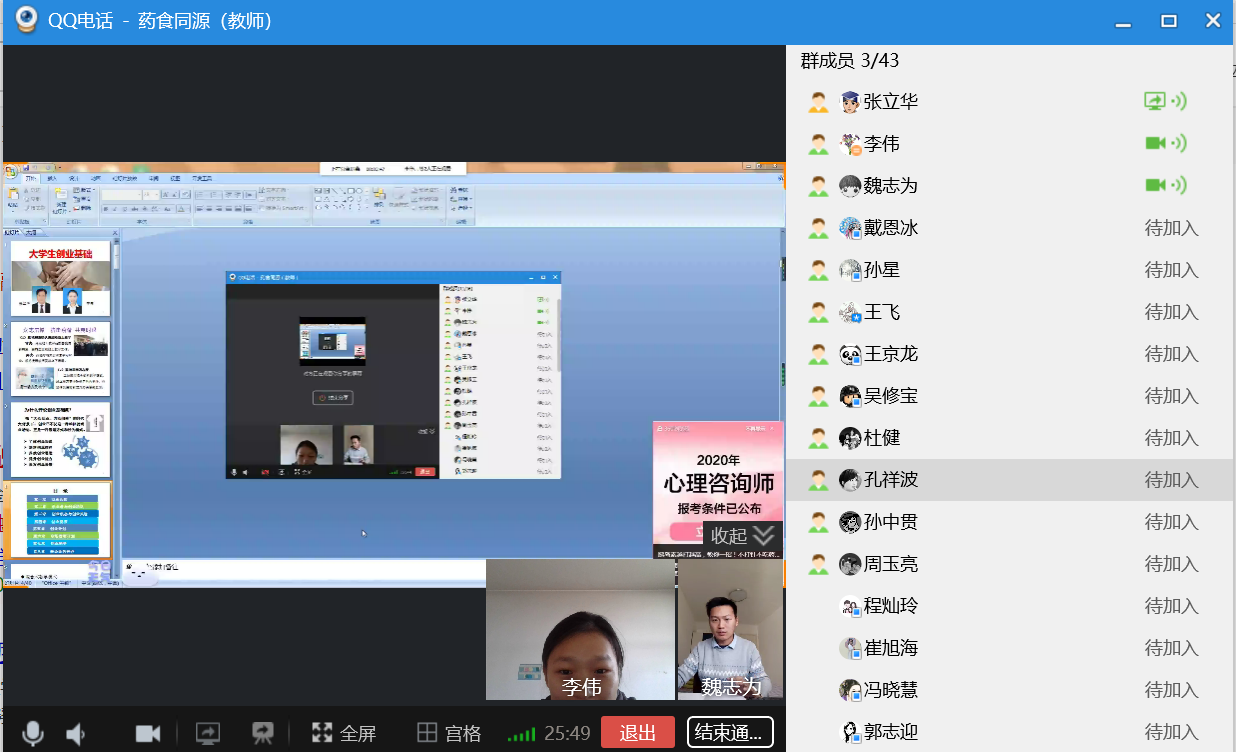 积极响应学校的号召,团队教师们积极参加线上教学的技能培训(包括雨课堂、中国慕课等数据库平台),学习开设网课相关的技能。通过前期的线上培训和交流,考虑到本课程的性质和特点,团队决定采用“雨课堂+QQ直播”的方式进行授课,并投入了大量的时间和精力来准备网课。