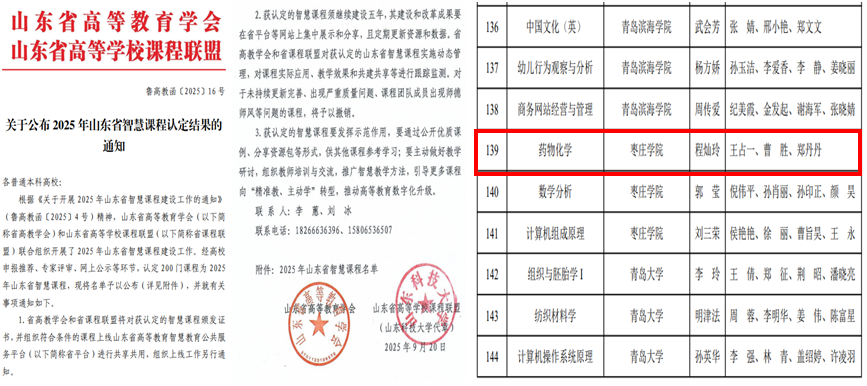 近日,山东省高等教育学会、山东省高等学校课程联盟公布了2025年智慧课程认定结果,买球官方网站程灿玲老师主讲的《药物化学》课程成功入选。这一成果的取得是食药学院贯彻落实枣庄学院“智能+”赋能教育教学改革“4+2”行动实施方案的具体实践,也标志着食药学院在人工智能赋能教育教学方面取得突破性进展。